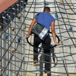 Jamye hanging off a wooden pillar. This one looks a little goofy, but the bag looks awesome.