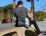 We like the shape of the concrete bench in this photo of Jacob with the M-7 Ice bag.