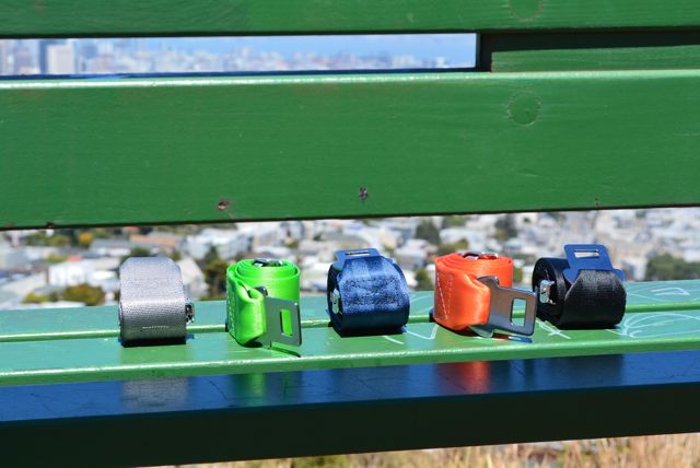 We wanted to get some action shots of our seatbelt webbing belts. We took five of them with us – black, dark blue, orange, lime green, and grey.