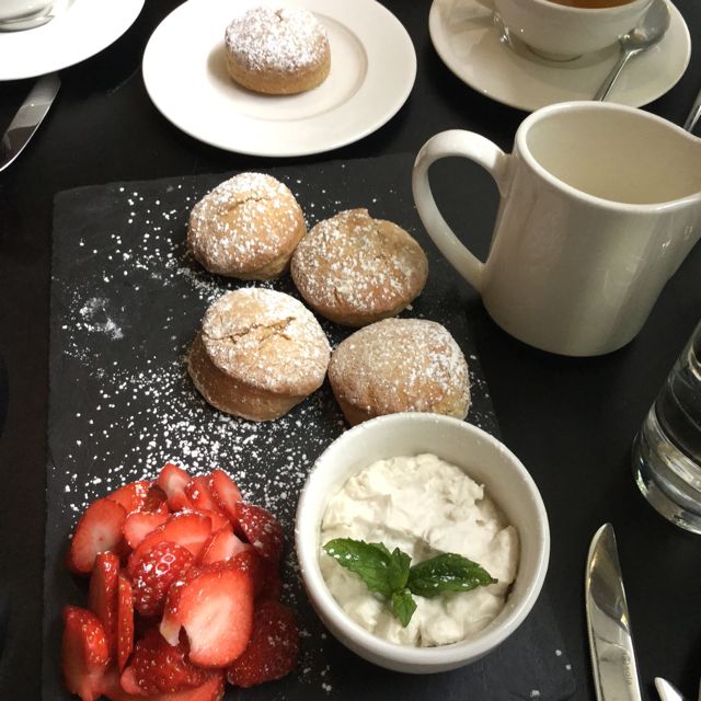 | This was followed by scones with coconut cream, strawberries, and strawberry jam. This course was our downfall as we felt compelled to eat the entire serving. | ![]() |