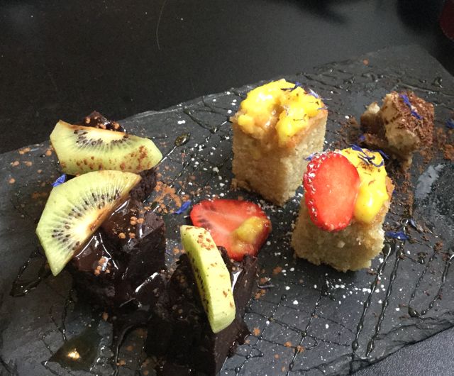 | The final course was a trio of desserts – a banana creme cake, lemon cake, and chocolate torte with kiwi. I switched to cappuccino for this round – also delicious. | ![]() |