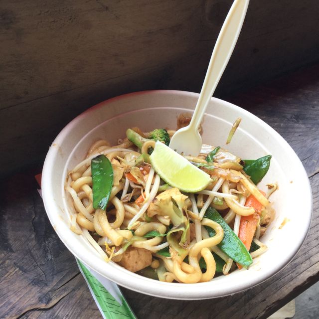 | The Hard Bowl (veggies with yam, boiled wholemeal dumplings, steamed plantaint & ackee in a thyme and pepper sauce), Noodle Bowl (vegan udon noodle stir-fry with roasted chili oil, coriander, and tofu & veggies), Da Infamous!! (Mummy’s green curry recipe from way back with tofu & veggies), and Yoga Fire (chickpea, sweet potato veggie curry with dhal). | ![]() |