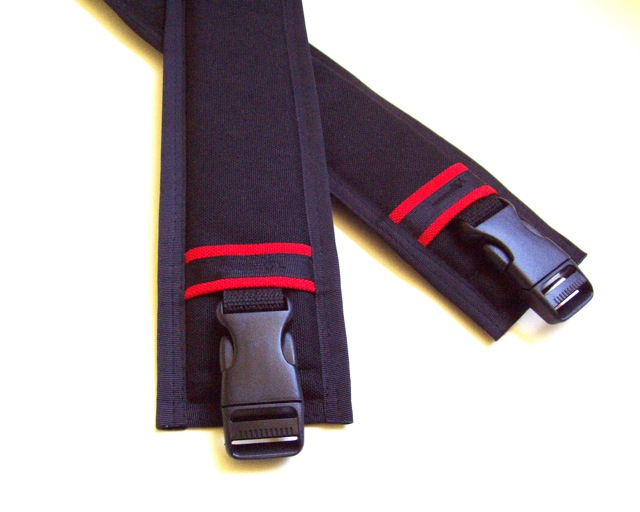 Then I started in on the straps. I wanted padded straps so I used 3 layers of 1/8″ closed cell foam that I stitched together about an inch from either end to avoid shifting. I had some trouble actually getting the foam inside the straps. I ended up attaching a binder clip and some string to the foam, feeding the string through the empty strap tubes, and pulling the foam through.